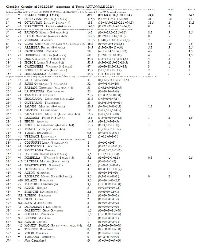 Classifica Circuito aggiornata al Torneo AUTUNNALE 2025